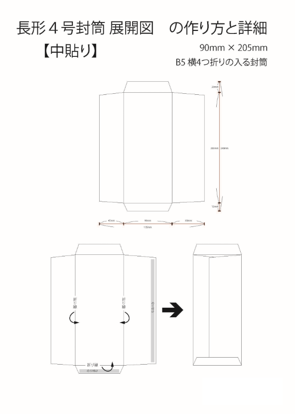 ②、右記の長形4号封筒展開図を参考に封筒を作成し送付。